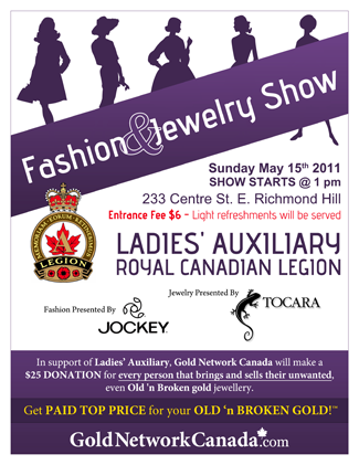 Fashion & Jewelry Show Gold Network Canada is honoured to give back. In support of LADIES' AUXILIARY, Gold Network Canada will be making a $25 DONATION for every person that brings and sells their unwanted, even Old 'n Broken gold jewellery at the May 15th fundraiser. Every person counts, so search your jewellery box for single earrings, broken chains and those outdated gold items you will never wear again. Bring them with you on and receive the highest possible payment on the spot.