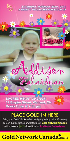 Make a Wish Come True Gold Network Canada would like to thank everyone that attended and sold their unwanted gold at Addison's fundraiser. If you missed out on this opportunity and would like to sell your unwanted, even Old ‘n Broken gold or would like to host a gold party in support of Addison – contact us for more information. Gold Network Canada is honoured to give back. In support of Addison Falardeau and her family, Gold Network Canada will be making a $25 DONATION for every person that brings and sells their unwanted, even Old 'n Broken gold jewellery at the January 29th fundraiser. Every person counts, so search your jewellery box for single earrings, broken chains and those outdated gold items you will never wear again. Bring them with you on January 29th and receive the highest possible payment on the spot. EVENT DETAILS
